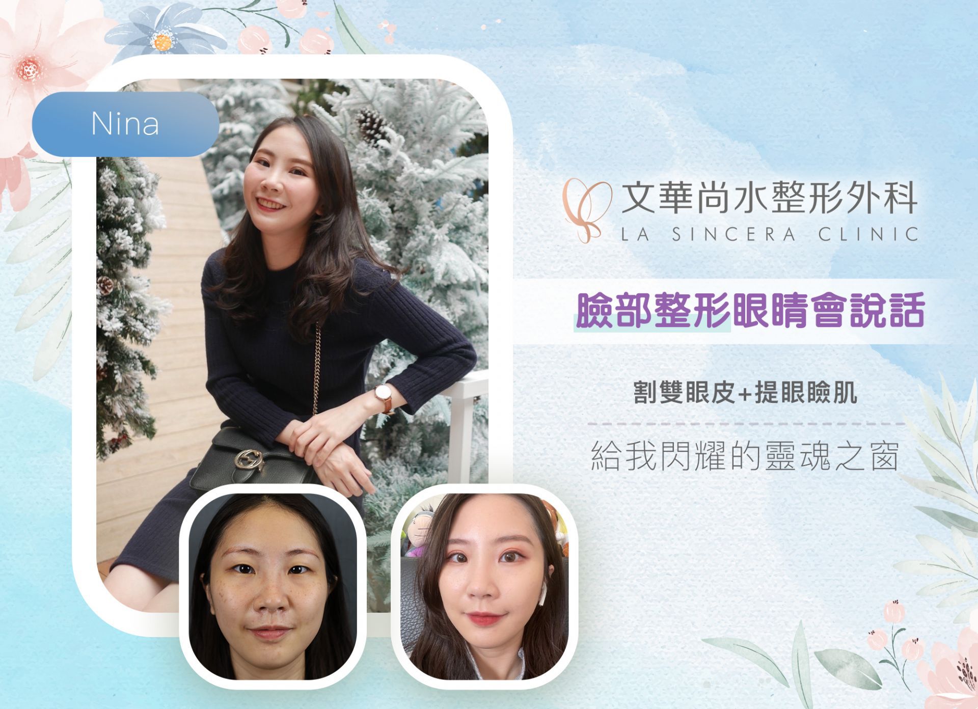 大約四週後,Nina的眼部已漸漸消腫,雙眼看起來平衡許多,傷口也保養得非常好,看起來沒有手術的痕跡,非常自然。本來就是美人胚子的Nina現在看起來更有活力、更加自信,笑起來時的雙眼也變得更靈動了!