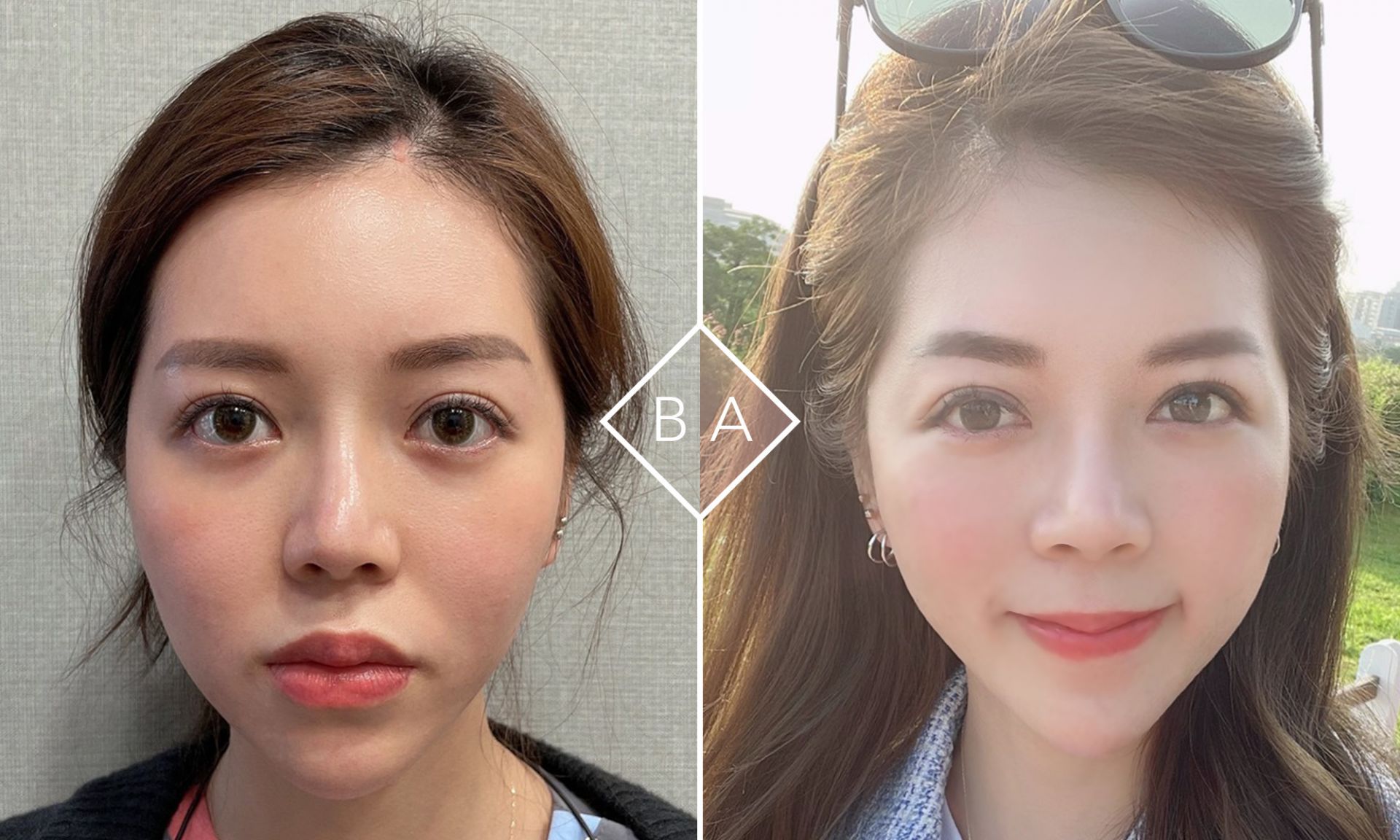 蔡文平醫師術後提醒要注意的是初期不能有太大的表情,術後隔天也能正常上妝。約一個星期後臉部逐漸消腫,原本的V臉看起來更迷人了。最讓Janet覺得有意外收穫的是,皮膚的狀況竟然日趨光亮,臉色也澎潤有光澤,這都是多虧了鈴鐺線埋入皮膚之後刺激人體產生自癒功能並產生膠原蛋白的緣故。