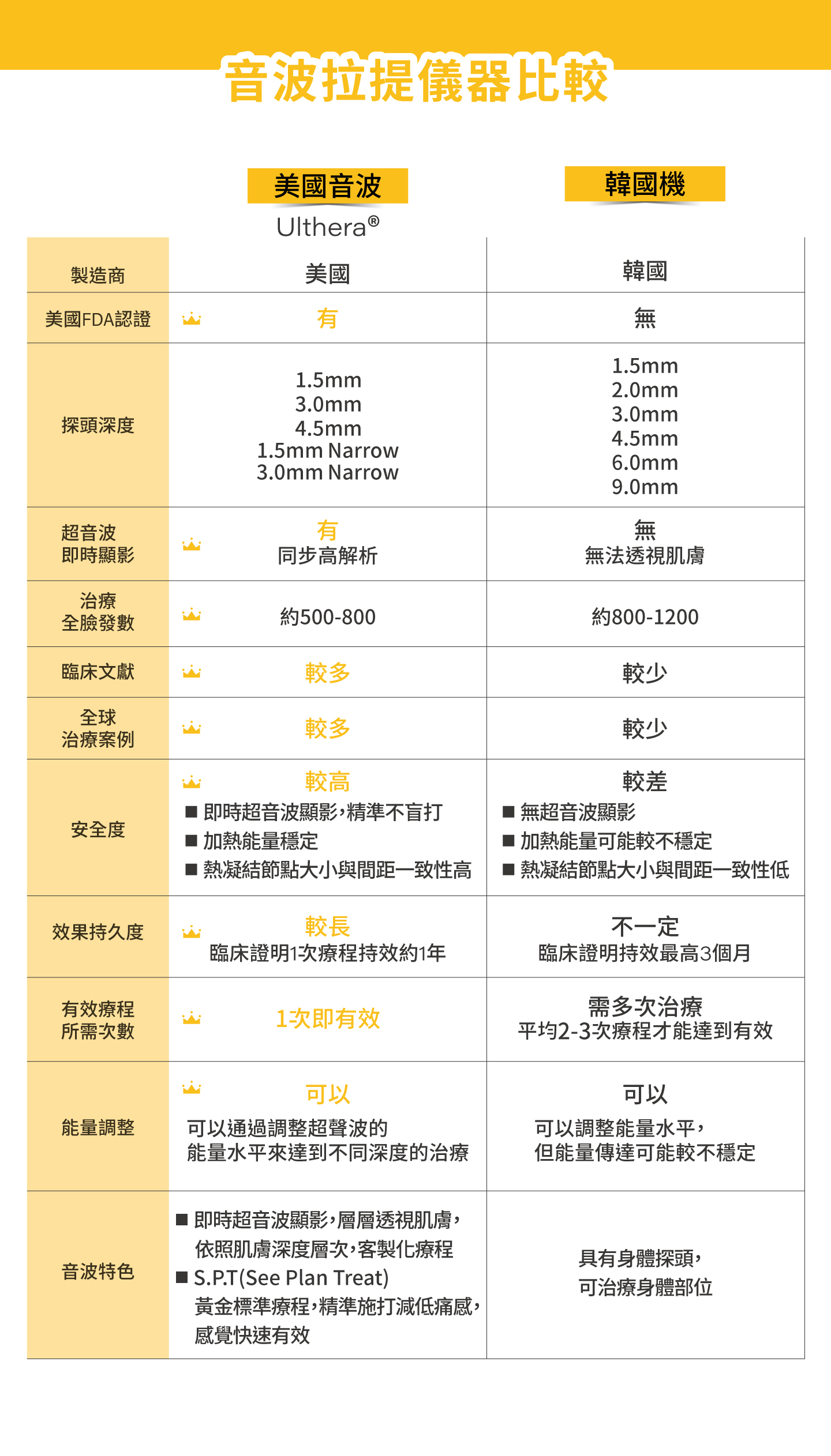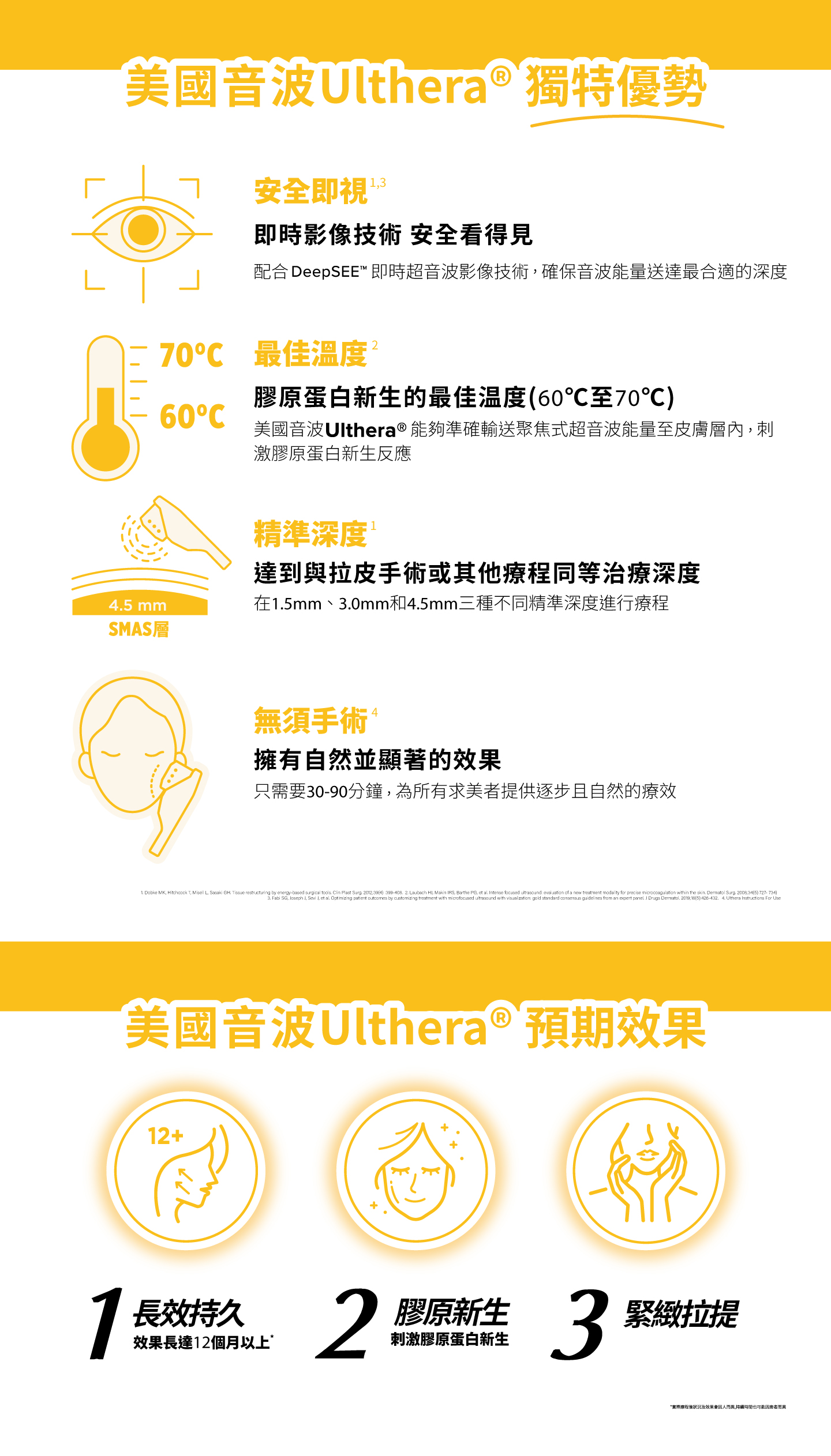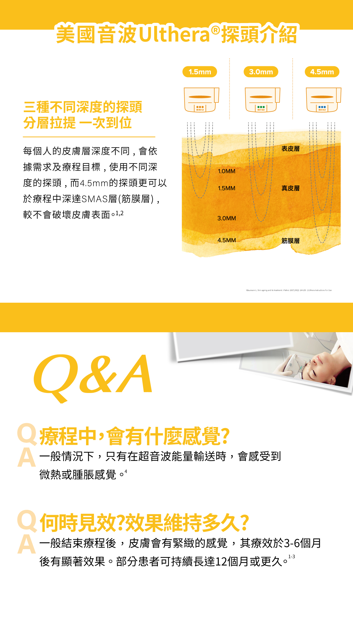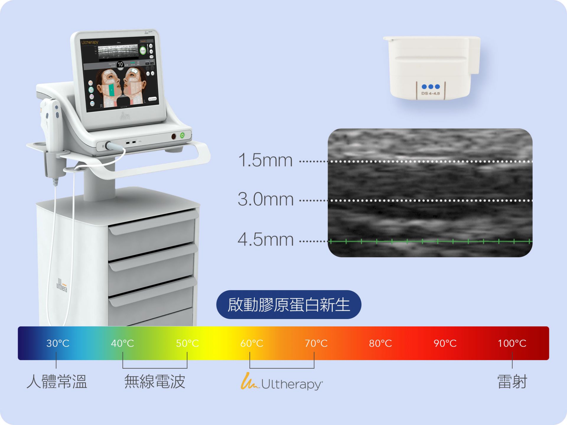 三種不同深度探頭——4.5mm、3.0mm、1.5mm,4.5mm針對SMAS層與頸闊肌、3.0mm針對皮下脂肪、1.5mm針對真皮淺層,可讓不同治療部位選用最合適探頭,在當下獲得最佳的效果。療程無傷口、無修復期,治療過程安全,使膠原蛋白增生,進而讓肌膚能夠更加緊緻、上提,是現代許多愛美族的選擇。
