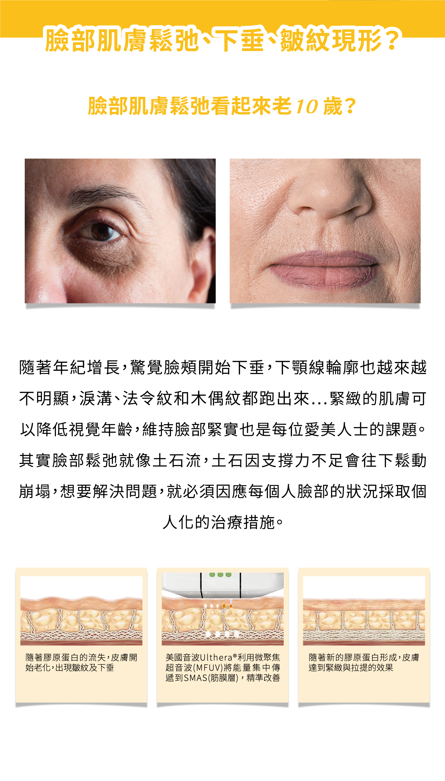 一旦年歲增長,皺紋就會無情地出現在臉上,從額頭、眼角、嘴角一直到脖子,再怎麼打扮還是看起來又累又疲憊,讓人自信逐漸降低!所謂老化其實就是SMAS筋膜層支撐力不足,衍生出的下垂鬆弛等問題。