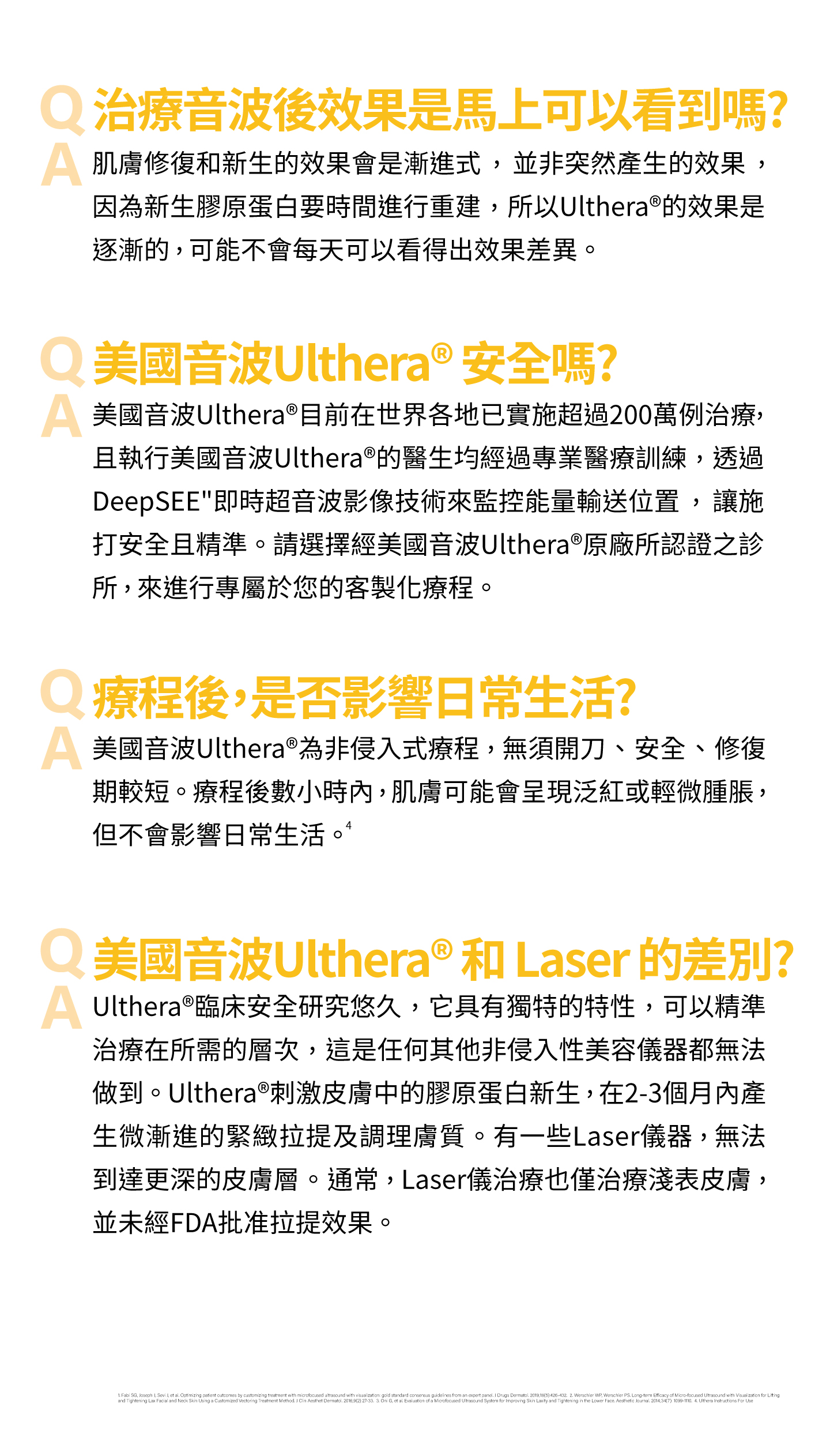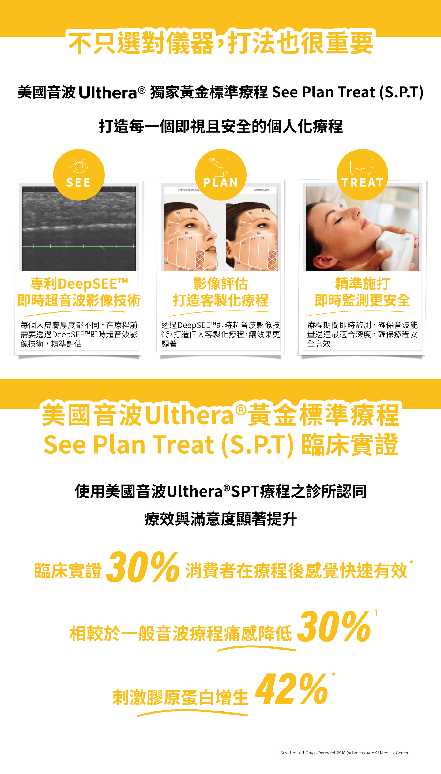Ulthera音波拉提以非侵入性的方式進行治療,經由雷射高能量聚焦,在SMAS組織上產生排列整齊有序的專利熱凝結點,這些熱凝結點能引發膠原蛋白再生反應,帶來緊緻、拉提效果。
