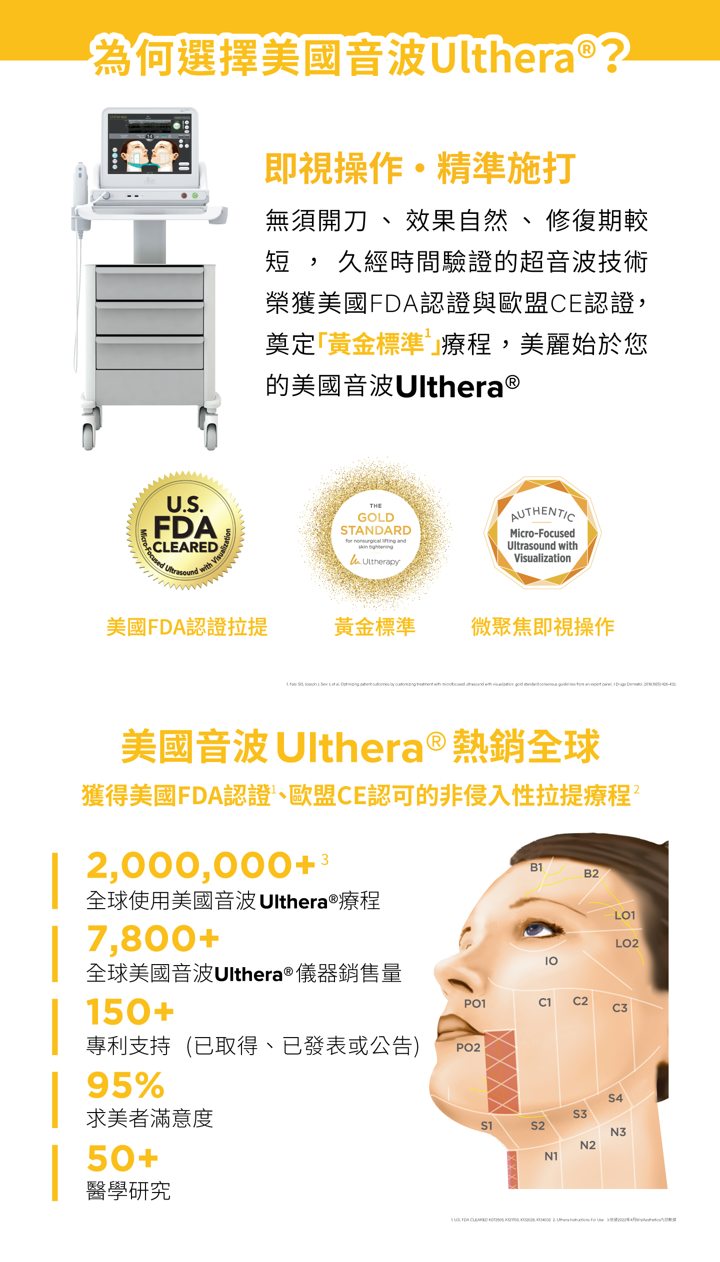 Ulthera 極線音波是最早提出以聚焦超音波(HIFU)方式,用於拉提皮膚的機種,也是通過美國FDA核准與衛福部審核通過之專利機型,經由皮膚基礎層提供聚焦超聲能量來刺激膠原蛋白的產生,建構新的膠原蛋白達到輪廓上提與緊實效果,且不會破壞皮膚表面。